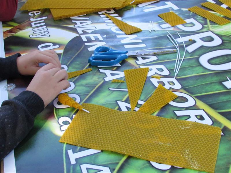 Taller/xarrada interactiva sobre la producció de cera de les abelles. Presentació/fabricació de ciris amb fils de cotons i vertaderes plaques de cera d'abella per a fabricar en directe amb els participants vertaders ciris de cera d'abelles. Els participants poden portar-se a casa les seues pròpies veles fabricades durant el taller.