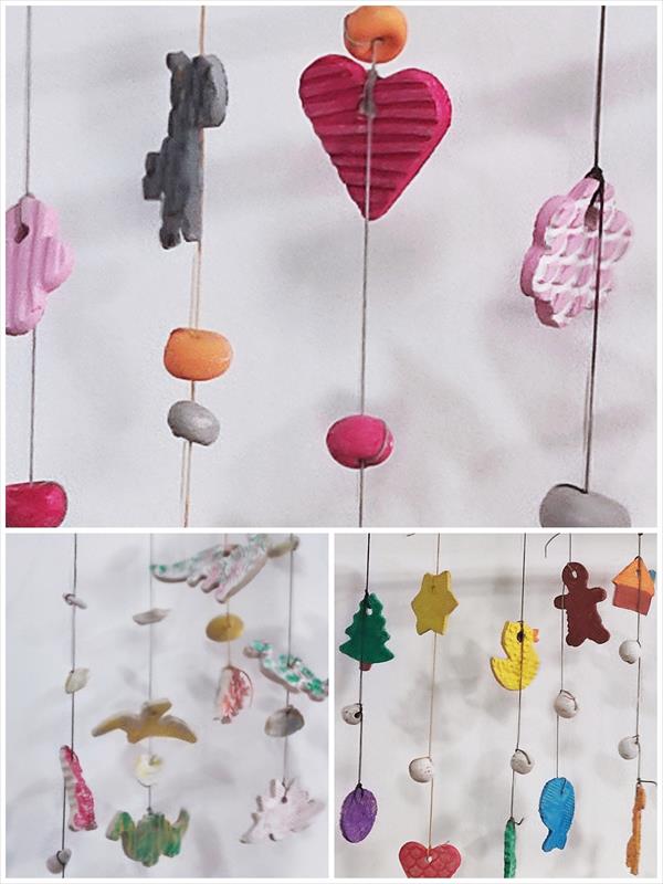 Modelarem amb fangs de colors i textures gravades, xicotetes peces que es mouen agitades pel vent. Crearem i decorarem les formes del mòbil i articularem les seues parts per mitjà de fils i altres suports.