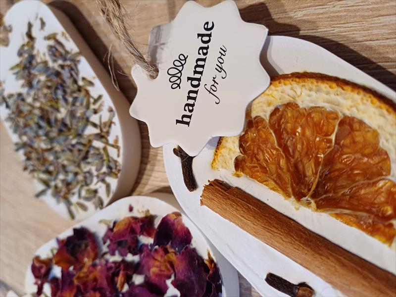 Escaiola, pètals de rosa, espècies, lavanda, fils i cintes, bosses embalatge, adhesius.