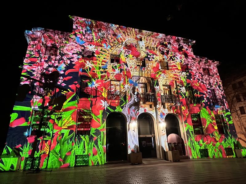 presa de luz de 32 A, distancia mínima entre proyector y fachada de 30 metros (plaza o espacio abierto sin obstáculos), vallas seguridad para el andamio y apagón total del alumbrado durante la proyección.