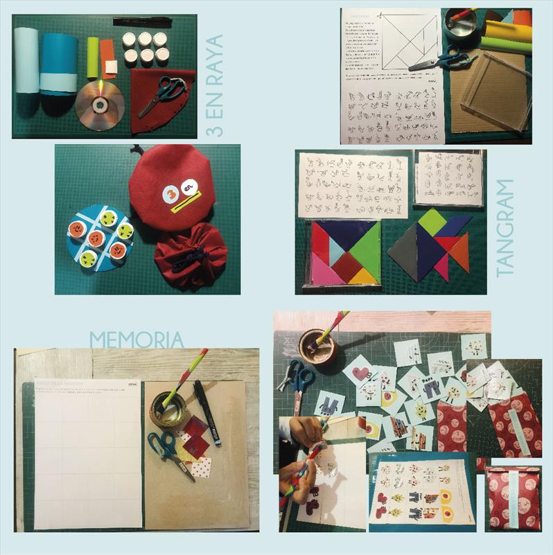 En este taller crearemos juegos clásicos como: tres en raya, tangram, juego de la memoria, etc., pero en formato que puedan guardarse en un bolso o bolsillo. La idea es tener recursos para no tener que dar el móvil a los niños cuando nos lo piden por aburrimiento.